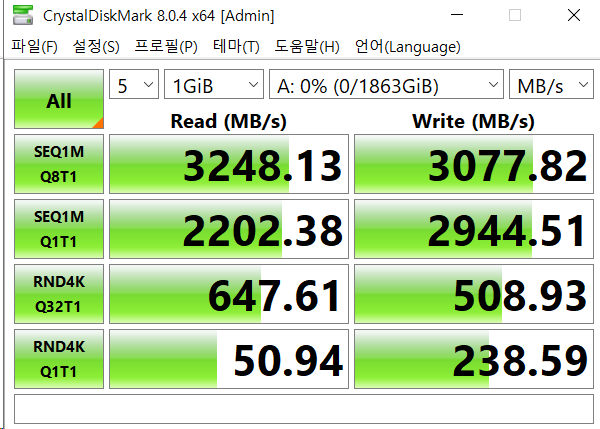 웃긴점은 PC 메인보드에 직결(외장이 아닌)할 경우에는 사진처럼 속도가 제대로 나온다.