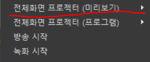 여기서 전체화면 프로젝터(미리보기) 에서 커서를 대면, 현재 장착한 캡처보드의 이름이 뜨게 된다. 그걸 클릭하면,